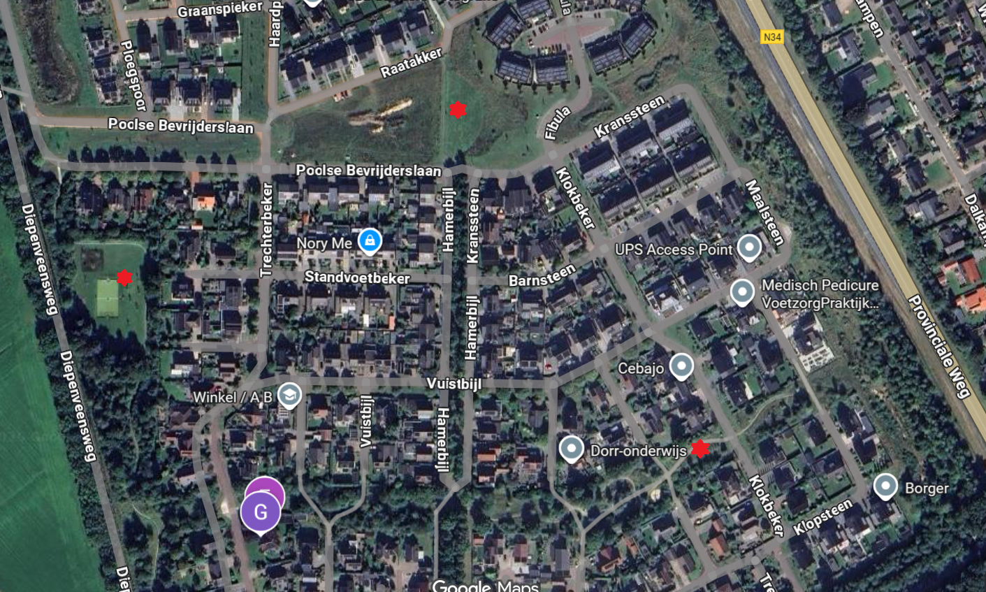 De speeltuin onderdelen zijn weergeven met rode sterren